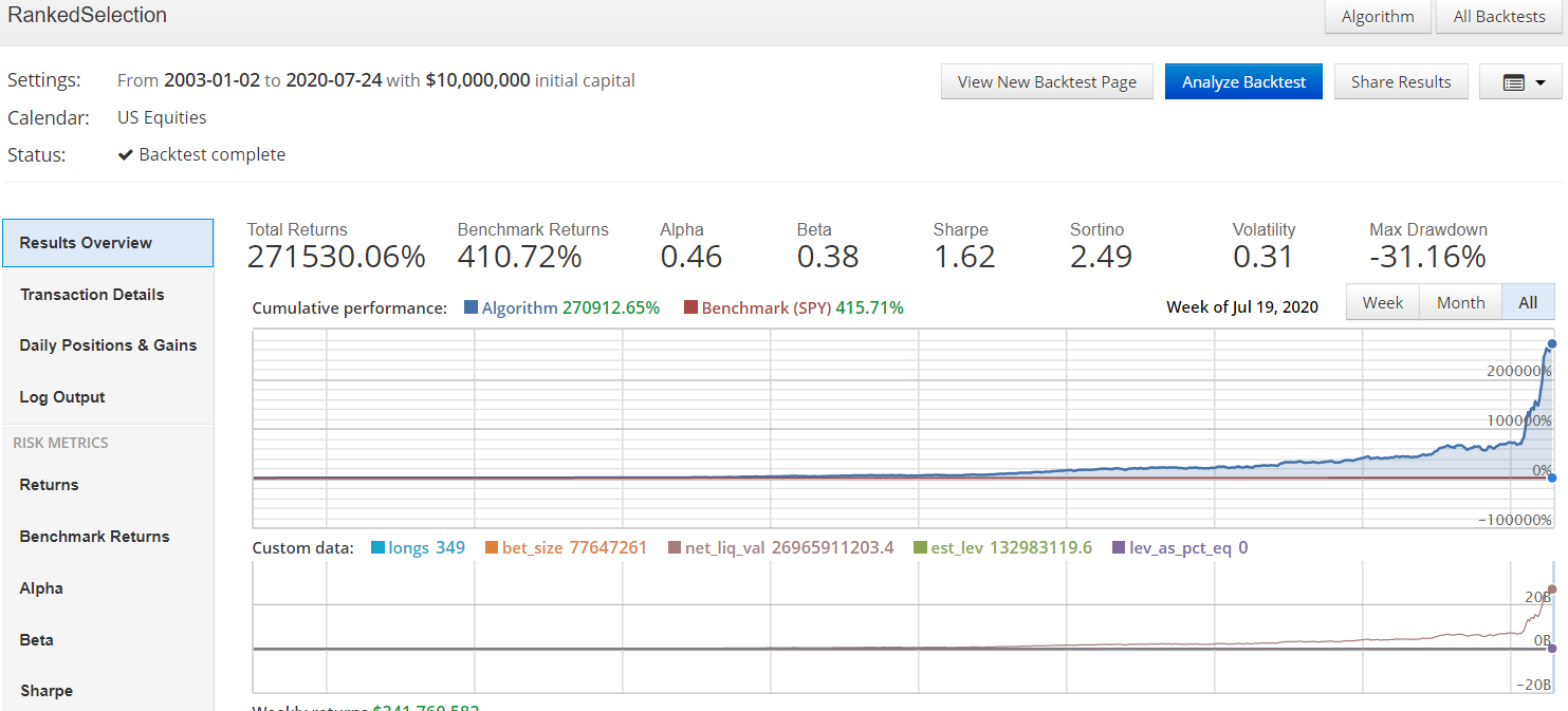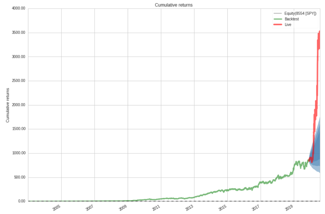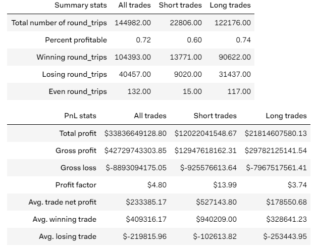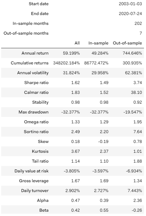 The following charts are the same as used in the previous simulation. In the backtest analysis, my favorite section is: round_trips = True. It is where I get the numbers for my equations.