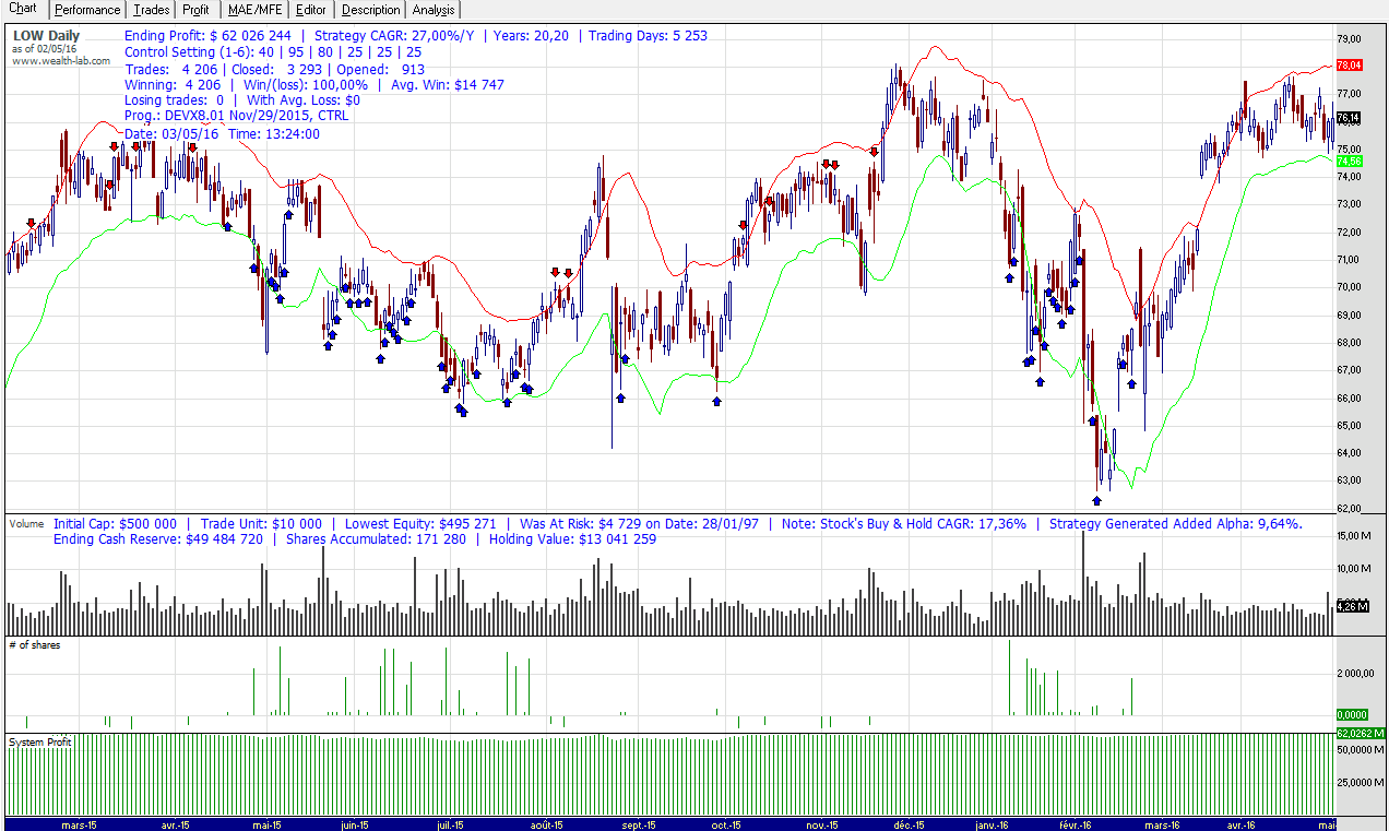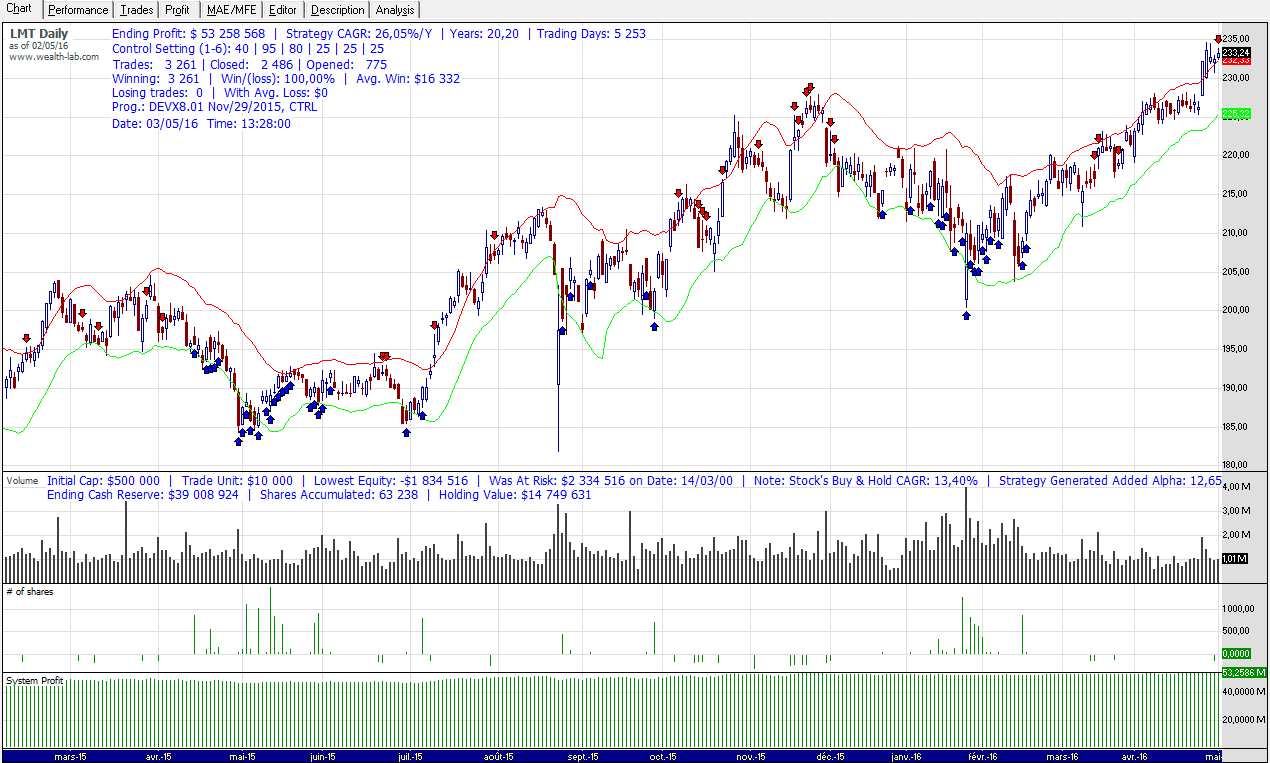 The trading strategy used was last modified on Nov. 29th, 2015, making the present tested stocks as if on a 5-month walk-forward out-of-sample test. While the media were touting that the sky was falling, that program was buying shares as directed. Its mission was to accumulate shares for the long term and trade over the process.